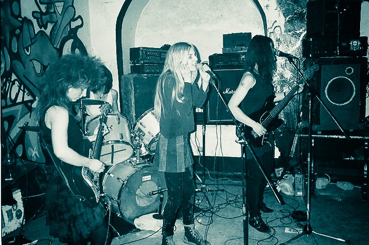 The most famous lineup. Anticlockwise from left – Bridget Wishart (vocals), Angela Bell (drums)  Claire Grainger (bass) , Sarah Evans (guitar)